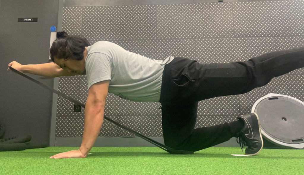 Step 2: Without allowing any movement to occur in the spine, kick one of your legs straight back while simultaneously raising the opposite side arm in a fist until both are fully straightened. Again practise the same breathing as done before. To make it more difficult place a resistance band under one knee and hold it in the same side hand. Perform these as an isometric hold for 10 seconds to 1 min.