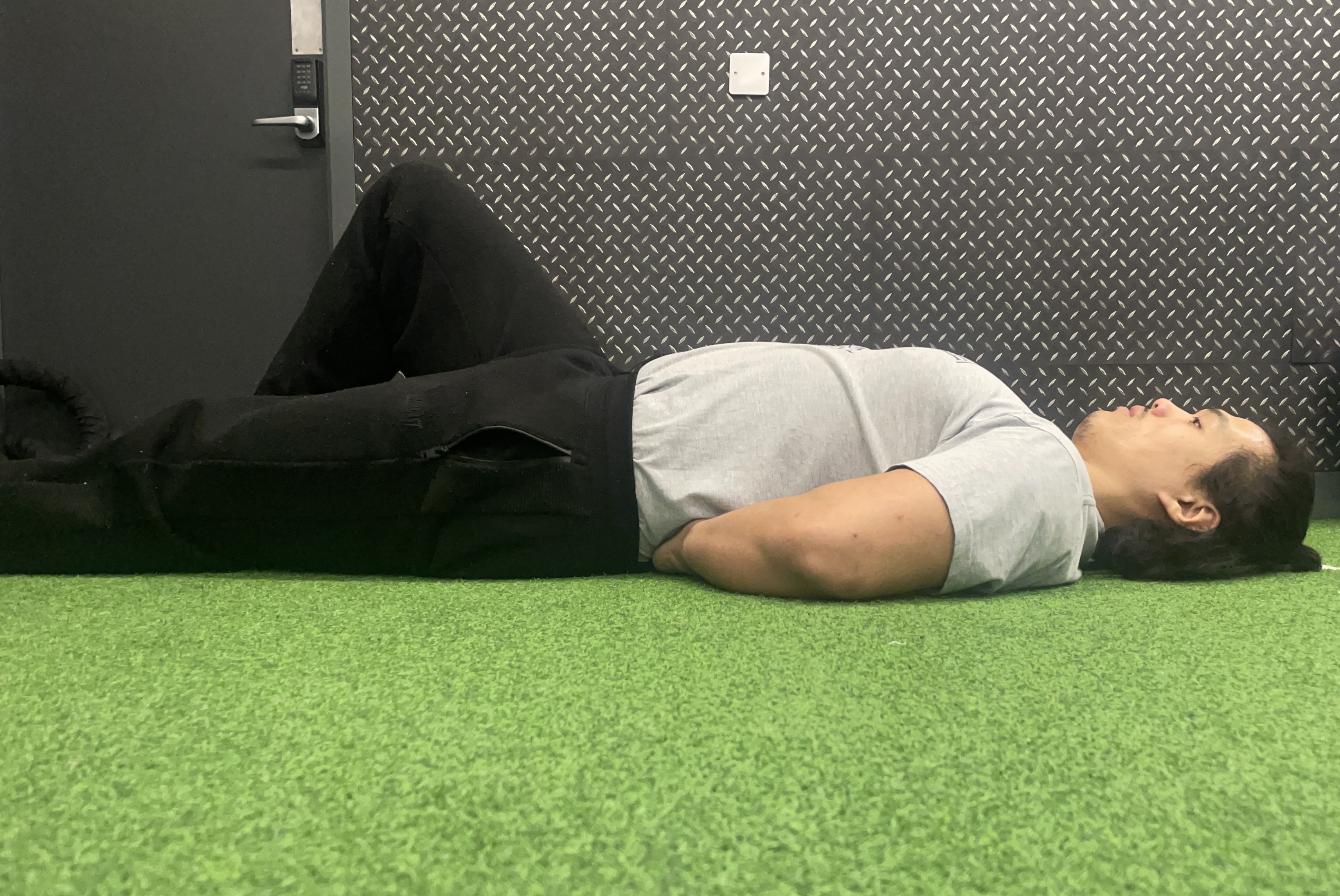 Step 1: Lie on your side with your legs straight and upper body supported through your elbow.