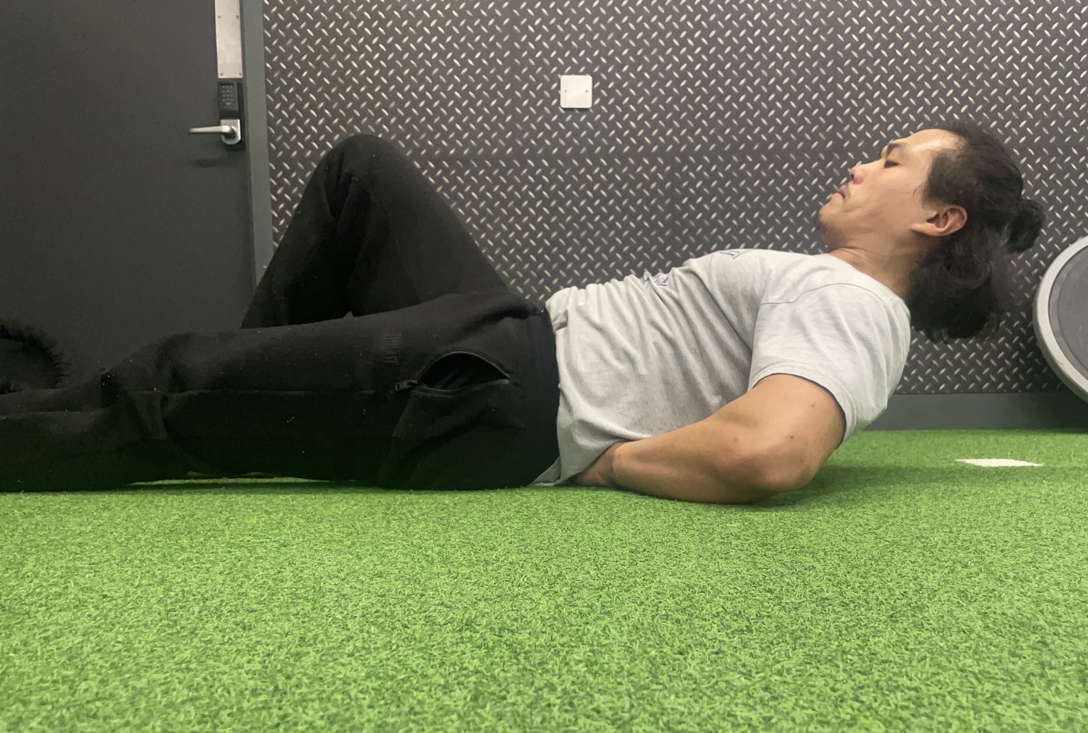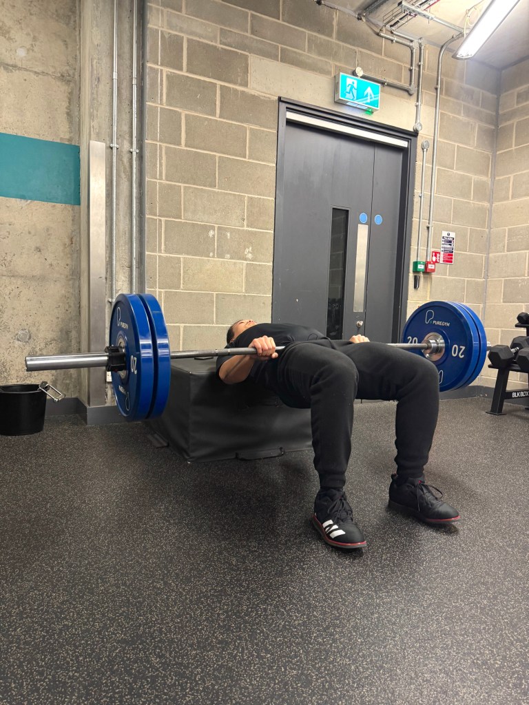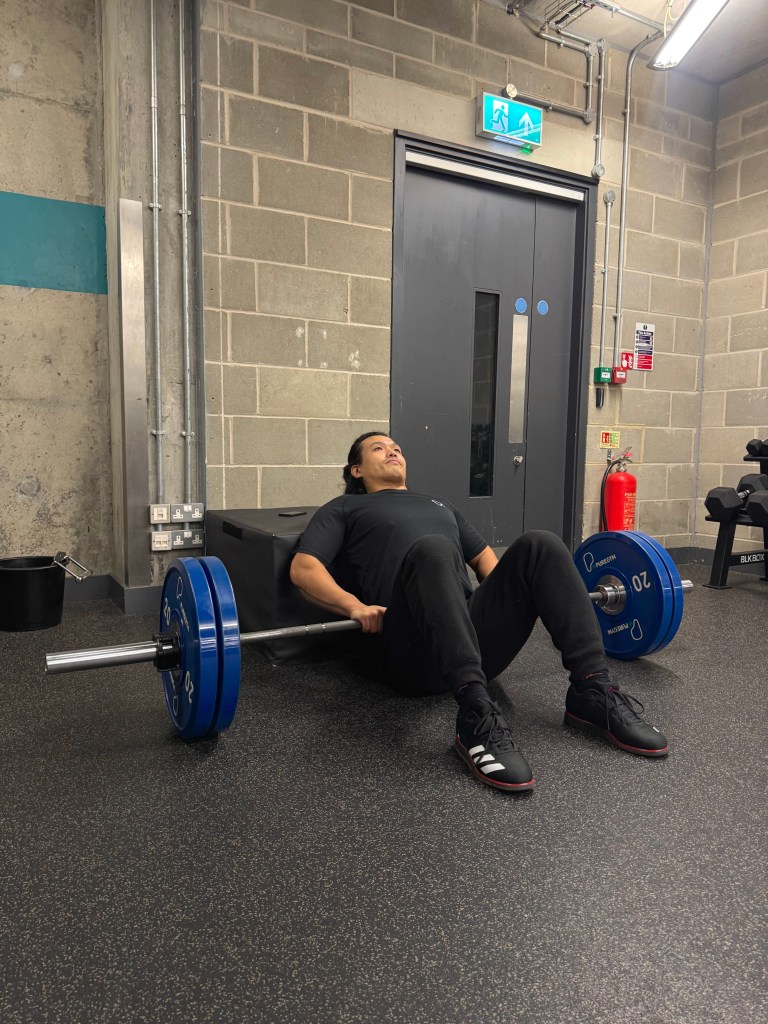 Step 3: Deep breath, brace your core, Drive your hips up till your spine and femurs reach parallel. If they aren’t find a platform which allows you to be parallel with the ground