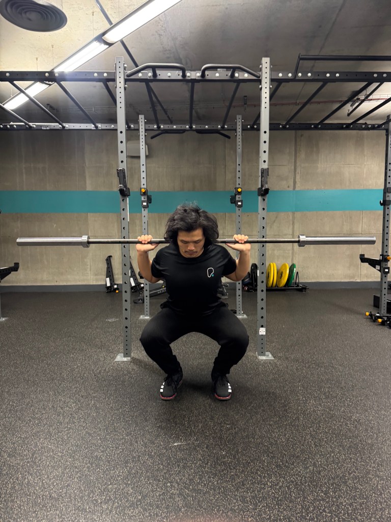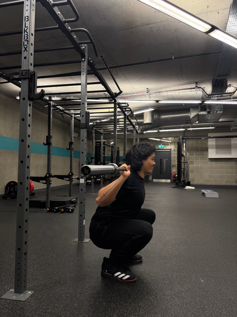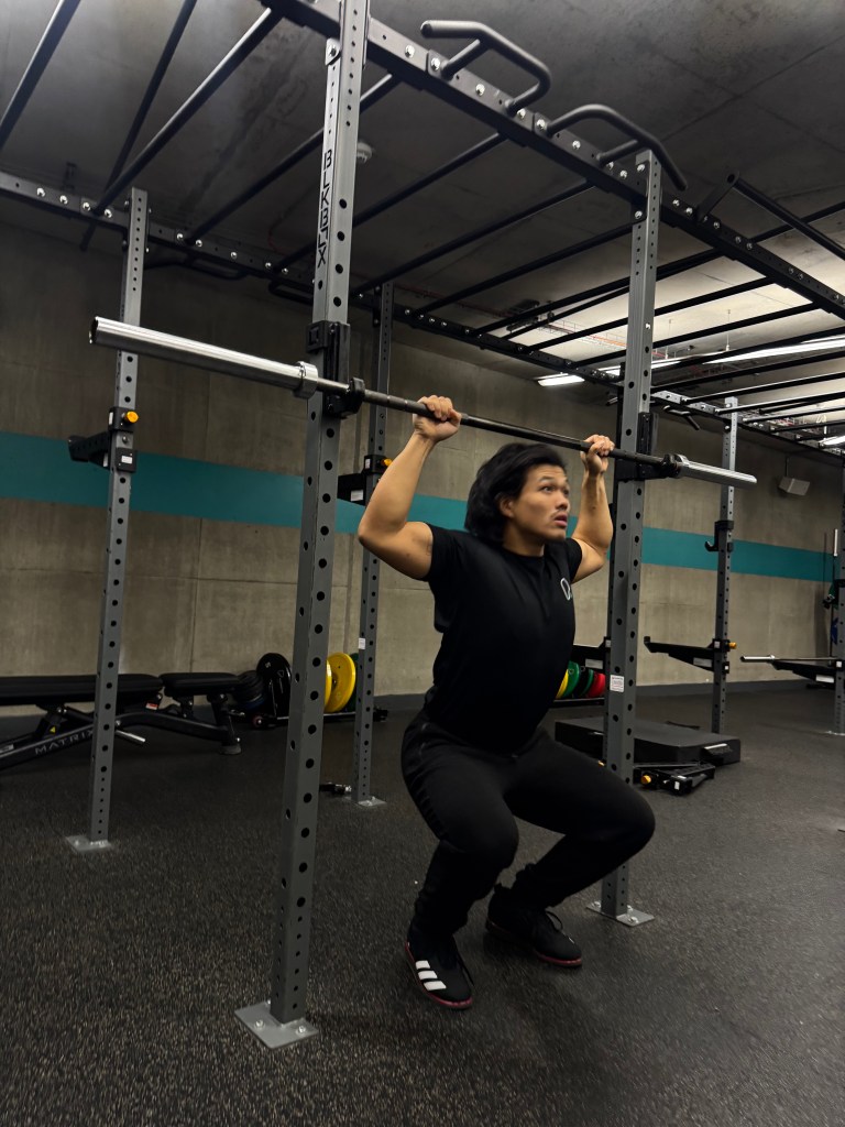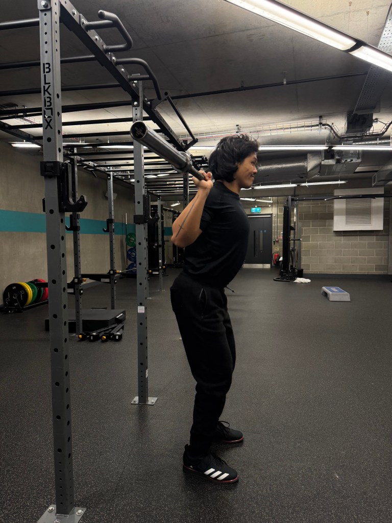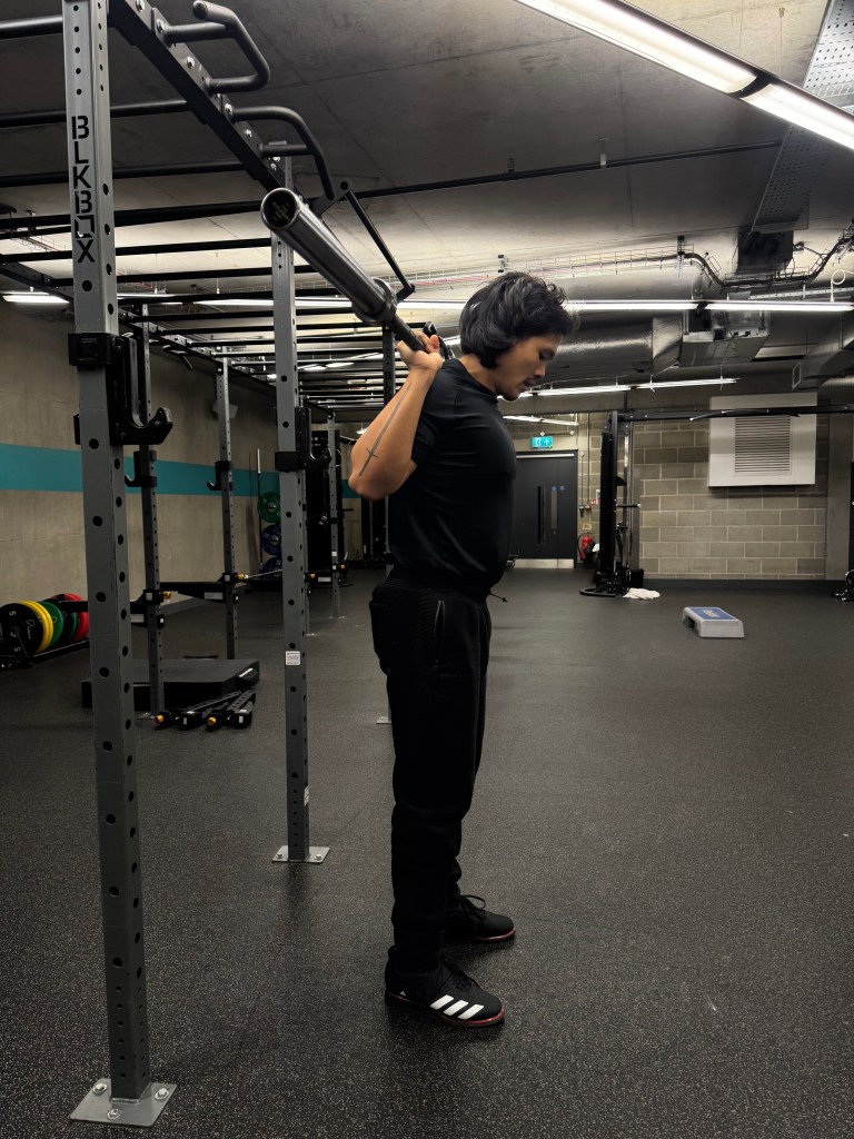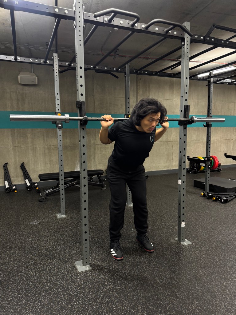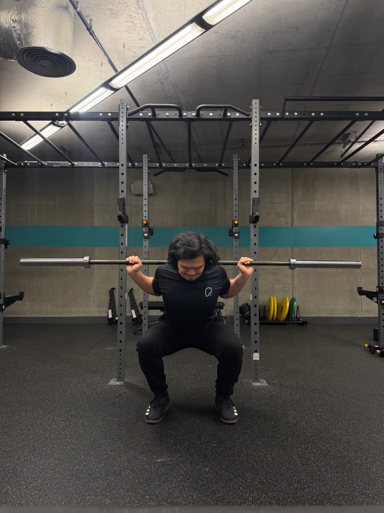 After the initial assessments you might find that you are someone who struggles to reach depth and maintain an upright position even with a wider stance. Do not fear!! You are built to low bar squat! This variation of the squat is used by many powerlifters to maximise strength gains by utilizing your posterior chain instead of your quads. Notice below how my hips sit further back and my torso leans further forward.
