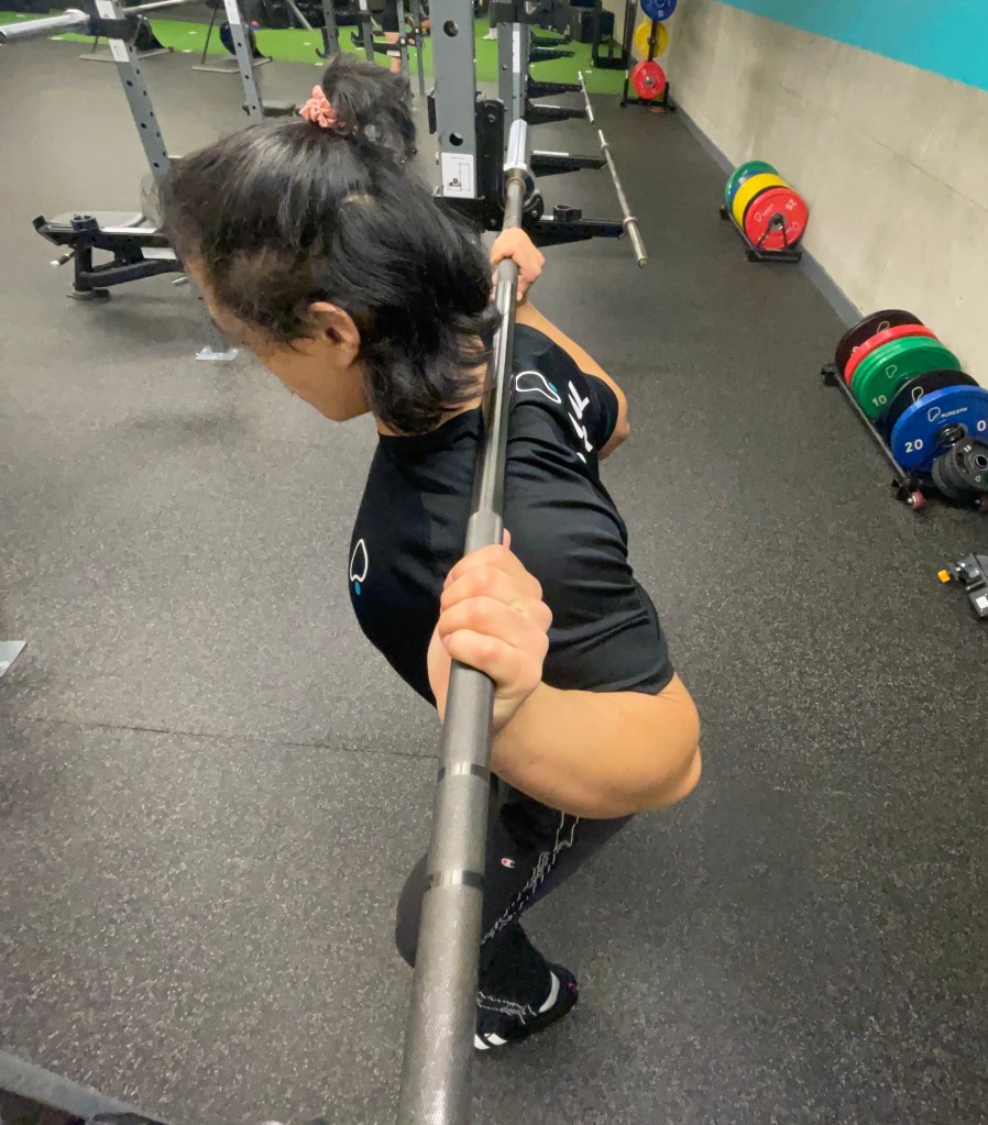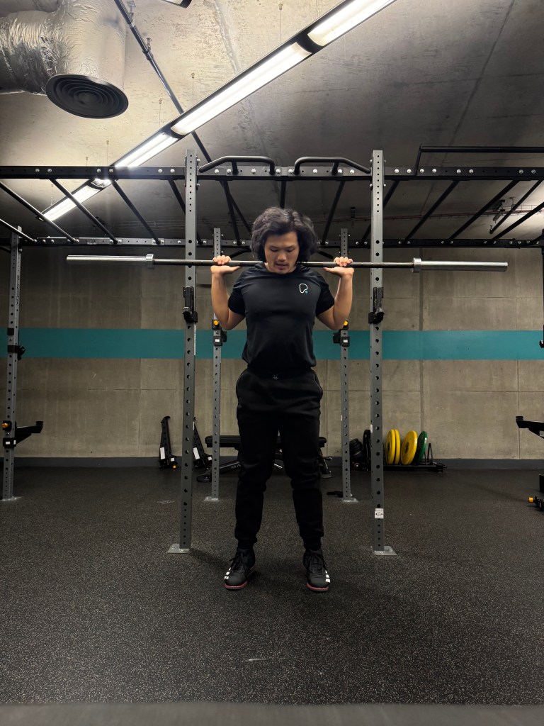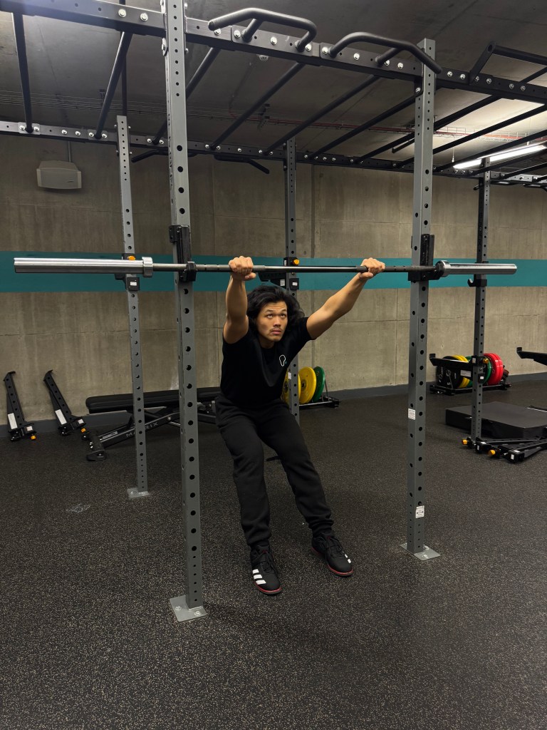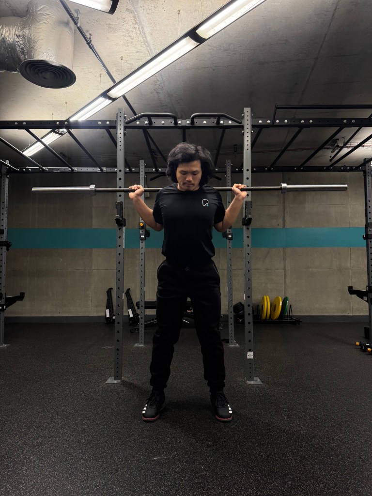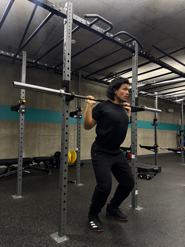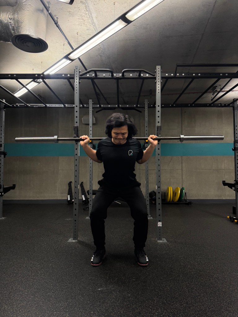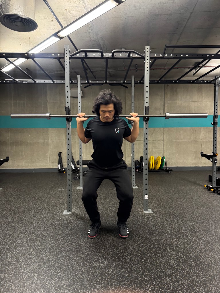 After the initial assessments you might find that you are someone who struggles to reach depth and maintain an upright position even with a wider stance. Do not fear!! You are built to low bar squat! This variation of the squat is used by many powerlifters to maximise strength gains by utilizing your posterior chain instead of your quads. Notice below how my hips sit further back and my torso leans further forward.