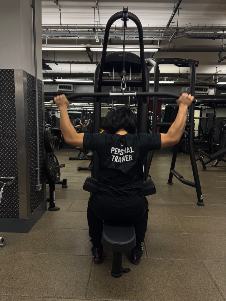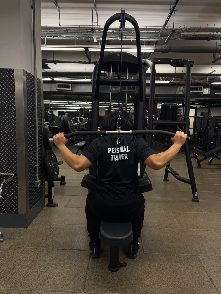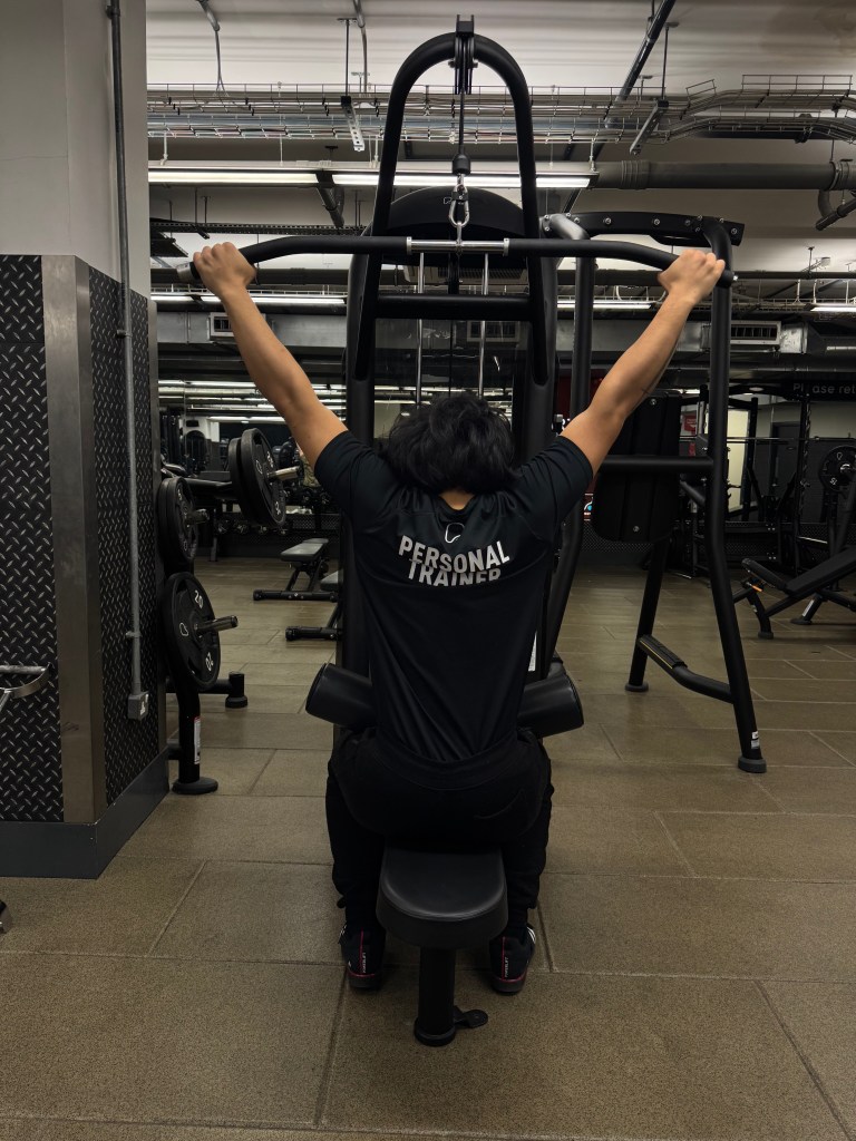 Step 3: Tuck your chin forward and down. Pull the handle behind your neck until it touches your traps. Slowly lower the bar back to the starting position. Pulling your elbows to your ribs is a good mental que.