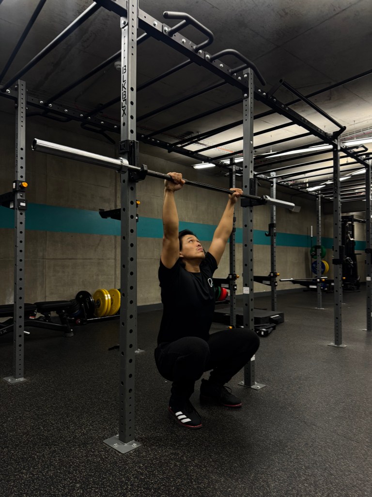 - Lift the bar of the hooks by brings your feet and hips underneath the bar and extending your knees.